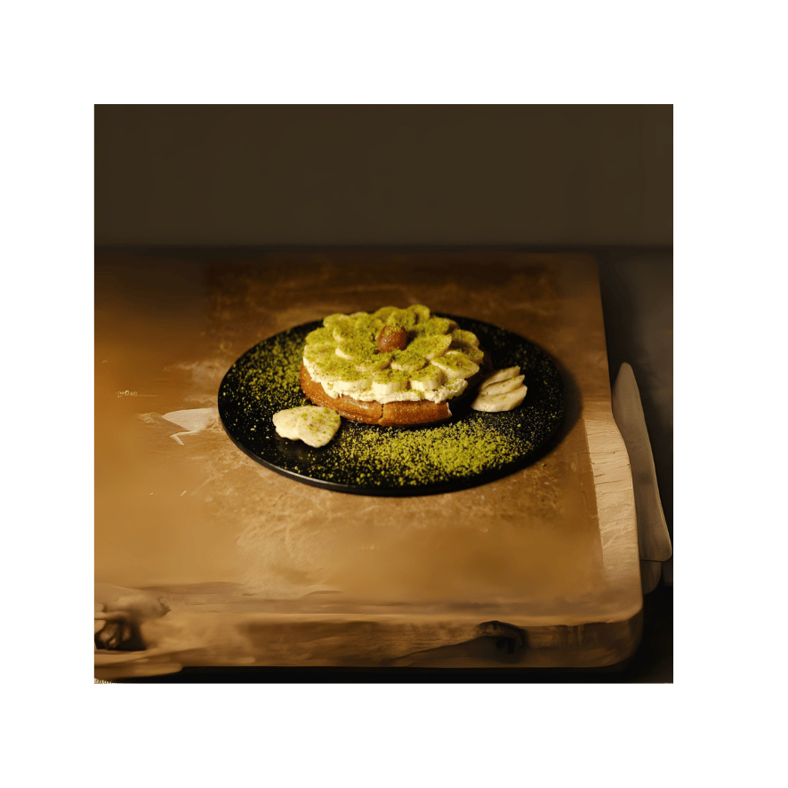 Kelep tatlısının üzerine kaymak ve dilimlenmiş muz eklenir. Üzerine fıstık serpilir.