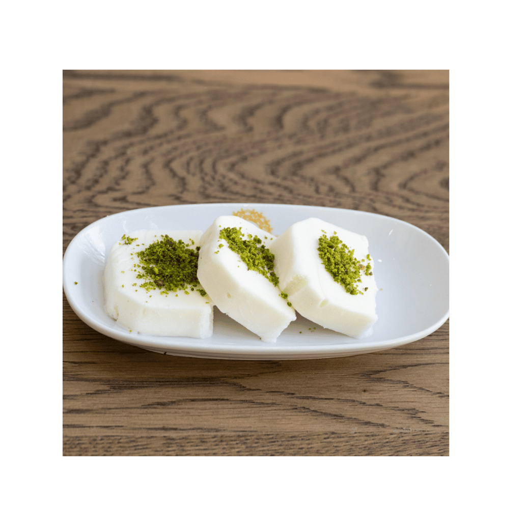 Kelep tatlısının üzerine tahin ve kaymak eklenir. Üzerine fıstık serpiştirilir.